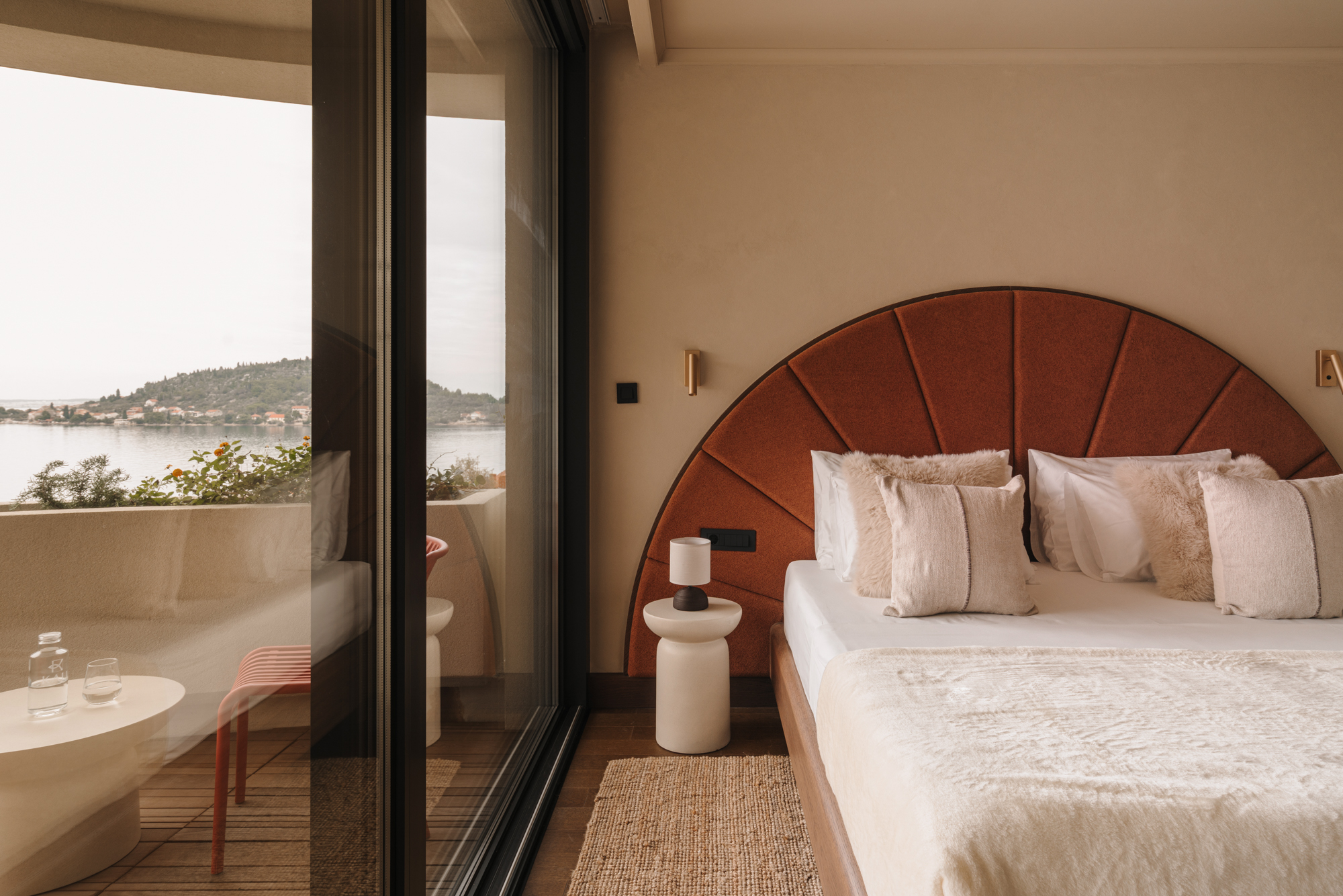 A quiet space designed for rest, reflection, and morning light. Our Queen Size Double Room is perfect for travellers who appreciate thoughtful comfort and minimalist elegance. Soft island tones, natural textures, and gentle light make this room a calm retreat after a day of exploring Ugljan. The queen-size bed is dressed in fine linens, and a well-appointed en-suite bathroom offers modern convenience with a subtle Mediterranean feel.